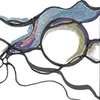 Abstraktes Kunstwerk mit bunten, fließenden Linien in Blau, Grün, Gelb, Orange und Schwarz auf weißem Hintergrund.
